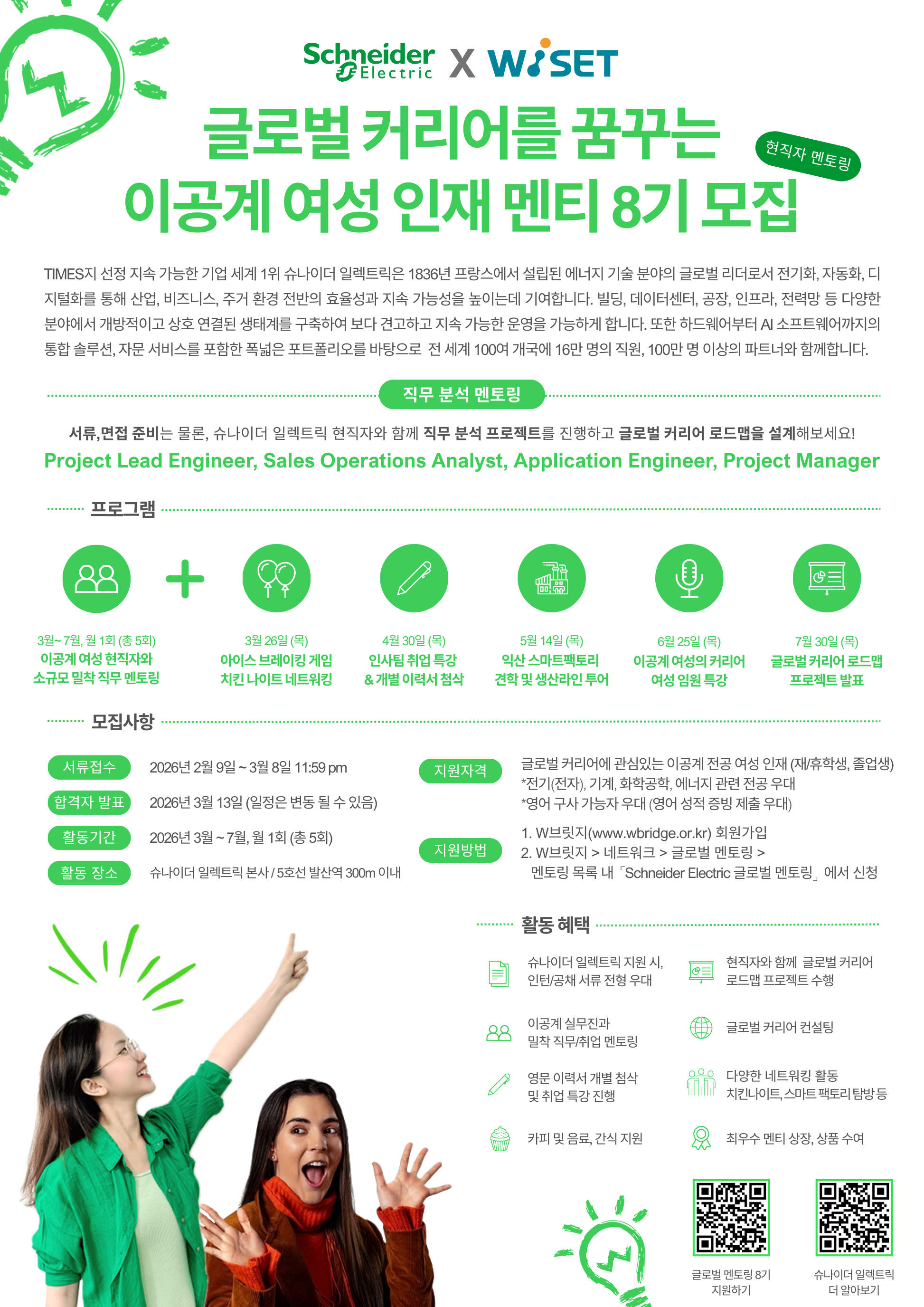 Schneider Electric | 이공계 전공 여자 대학생 16명 내외 - 전기(전자), 기계, 화학공학, 에너지 관련 전공자 우대 - 영어 구사 가능자 우대 | (활동 기간) 3월~7월(총 5회 활동 진행) (활동 내용) 스마트팩토리 견학, 커리어로드맵 프로젝트, HR 특강 및 이력서 첨삭 등 (신청 링크) https://bit.ly/3MSMC27 | ~3/8(일) |